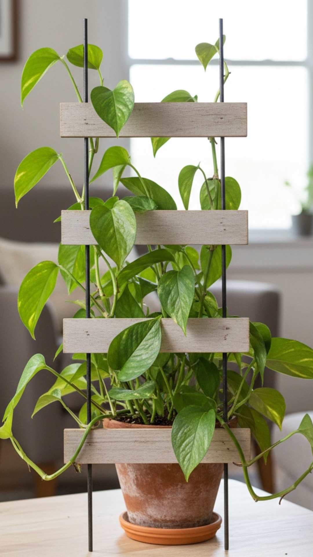 A small wooden ladder also works as a trellis. Put it in your pot and let the pothos climb its rungs.