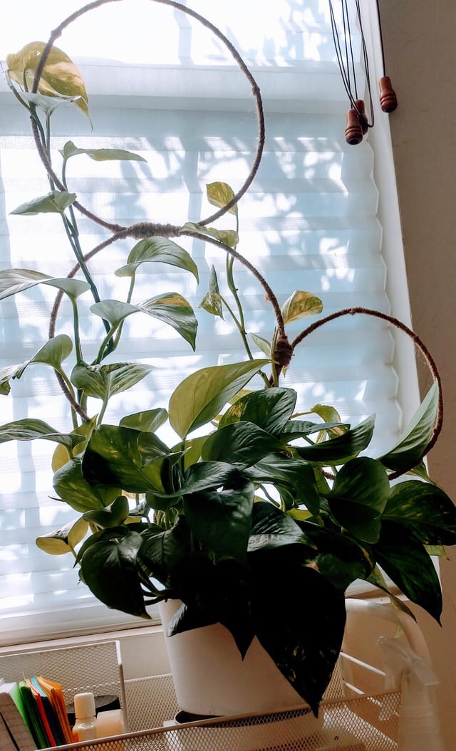 You can make simple trellis that works really well from bamboo sticks. Put them in a crisscross pattern and watch them guide your pothos vines to grow up.