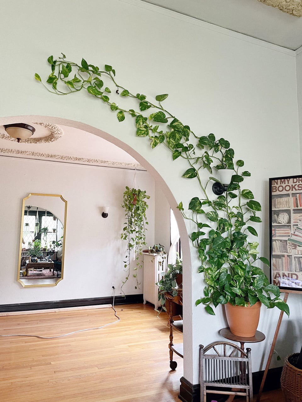 If you have an archway in your home then use some small hooks or wire grid to create a frame your pothos can grow around. It makes for a cool looking frame and a garden type of atmosphere in your home.