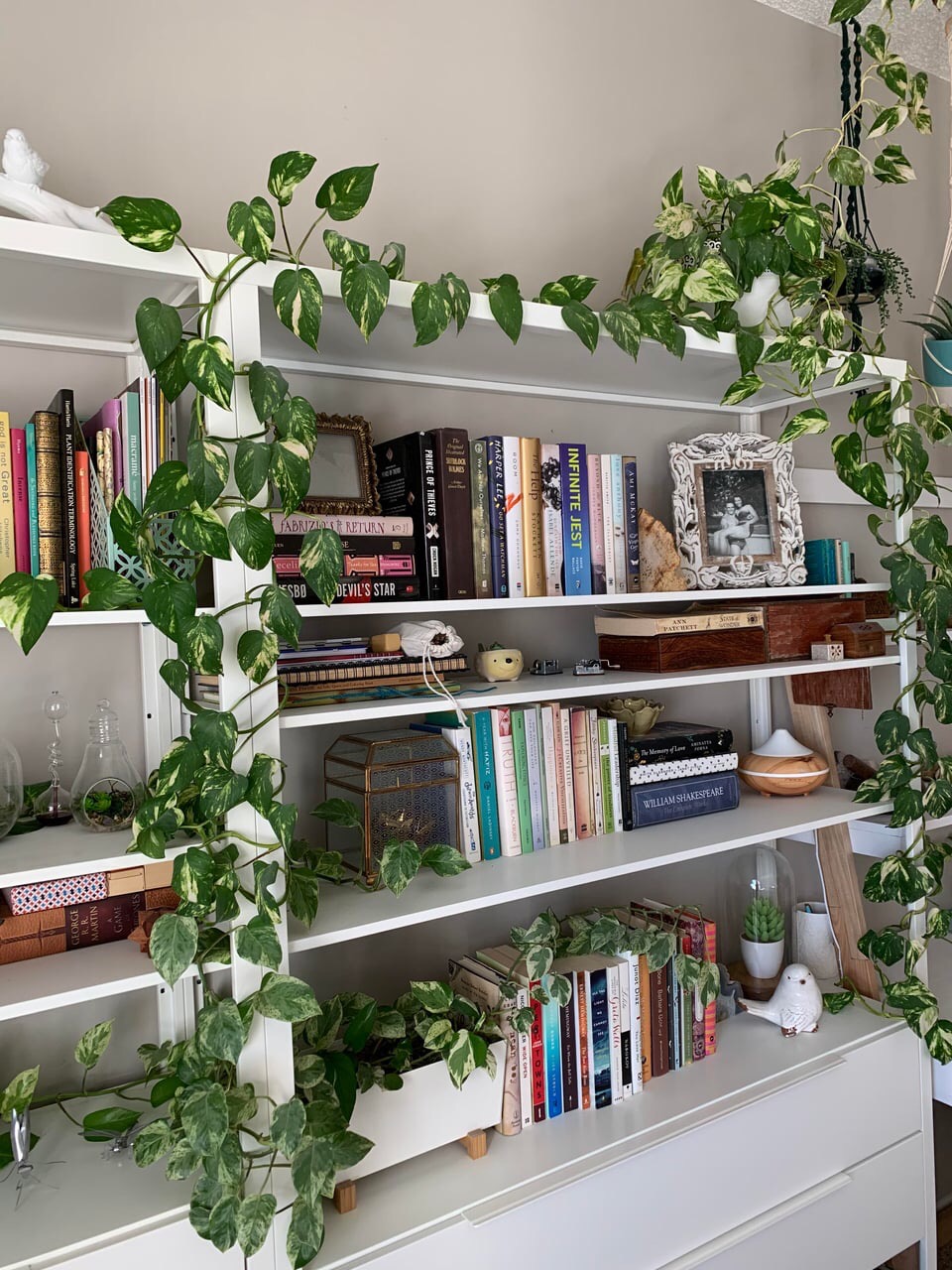 You can train your pothos to climb along the edges of a bookshelf. Use small hooks or ties and guide it along the edges or up the sides.