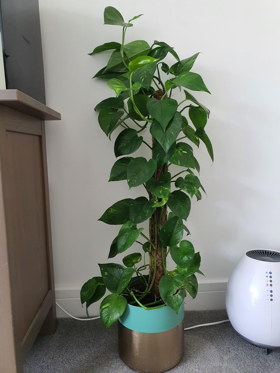 If one of the corners in your room is bare then put a tall moss pole or bamboo trellis in it. Your pothos will climb and it make that area feel softer and more interesting.