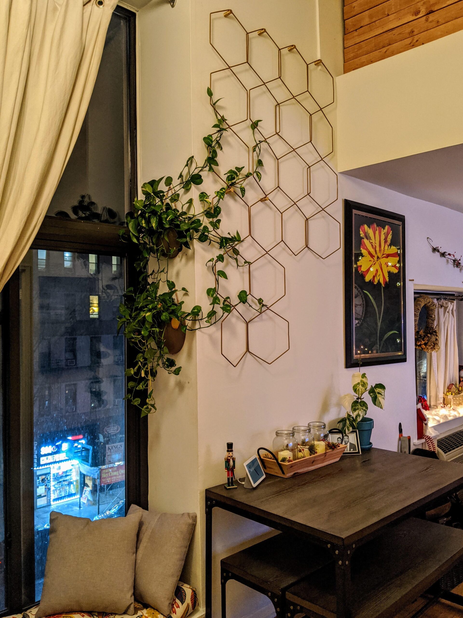 Fix a lightweight wire grid to your ceiling and train your pothos to climb it. You end up with a cover of Green throughout your living room or kitchen.